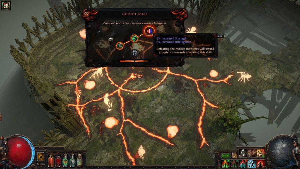 Crucible forges are scattered throughout Wraeclast. When you find one, you can select a weapon of your choice and channel the power of the ancient Titans for a challenging encounter. The longer you channel, the more molten monsters can fuse together to form terrifying foes. You possess the power to regulate the difficulty and benefits of these battles.